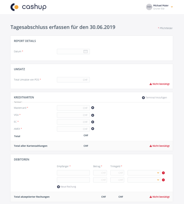 - Controlling von Tagesabschlüssen: Der Gastronom findet die in cashup eingegeben Umsatzdaten und Zahlungseingänge strukturiert pro Betrieb, Tag und Verkaufs- resp. Servicepersonal vor. Diese können kontrolliert und gegebenenfalls korrigiert werden, bevor die Daten per Mausklick alle Umsatzdaten und Zahlungseingänge in die Finanzbuchhaltung von Run my Accounts übertragen werden kann.